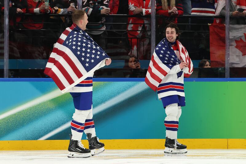 Ice Hockey - Milano Cortina 2026 Winter Olympics: Day 16 MILAN, ITALY - FEBRUARY 22: Quinn Hughes #43 and Jack Hughes #86 of Team United States speak as they wait for the medal ceremony for Men's Ice Hockey following the Men's Gold Medal match between Canada and the United States on day 16 of the Milano Cortina 2026 Winter Olympic games at Milano Santagiulia Ice Hockey Arena on February 22, 2026 in Milan, Italy. (Photo by Bruce Bennett/Getty Images) (Bruce Bennett/Getty Images)