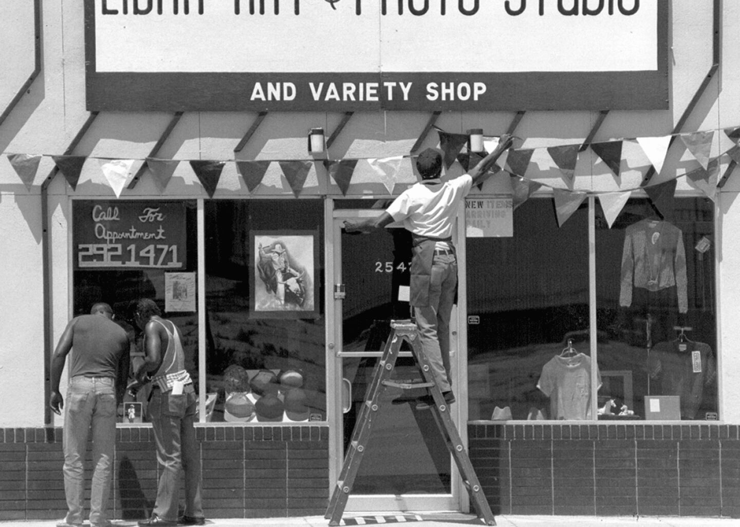 Today, you can easily find Juneteenth decorations at party supply stores and big box retailers like Walmart. But before the holiday was federally recognized, few places had specific decorations for the day. Here, a store owner hangs flags in front of his variety shop in the days leading up to the holiday.