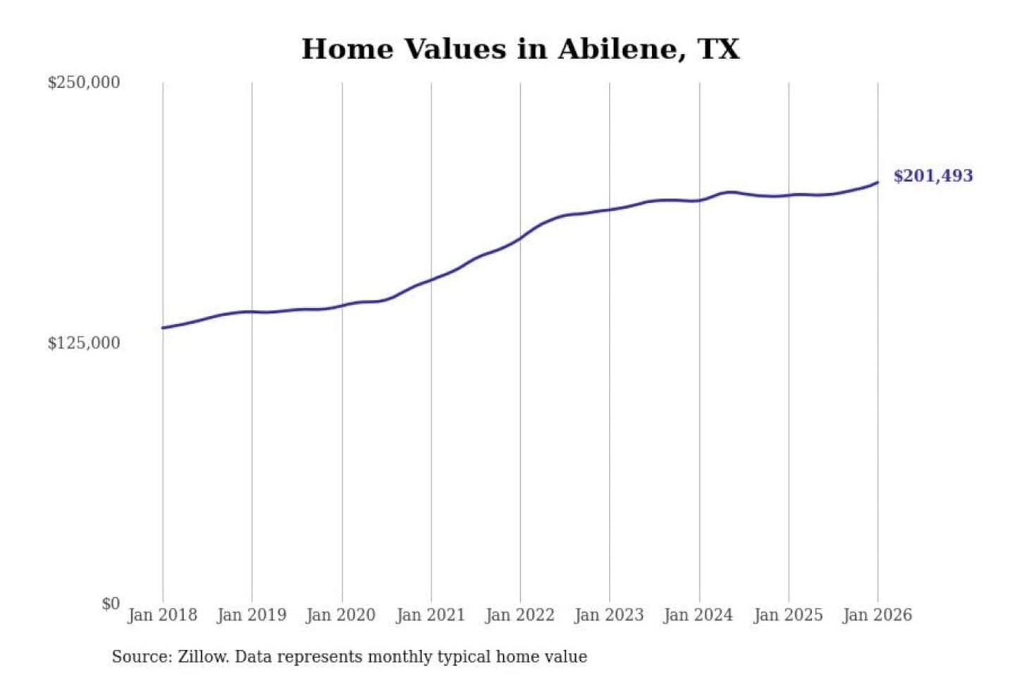 Stacker compiled a list of cities with the most expensive homes in the Abilene, TX metro area using data from Zillow. Charts show the monthly typical home value since January 2018.