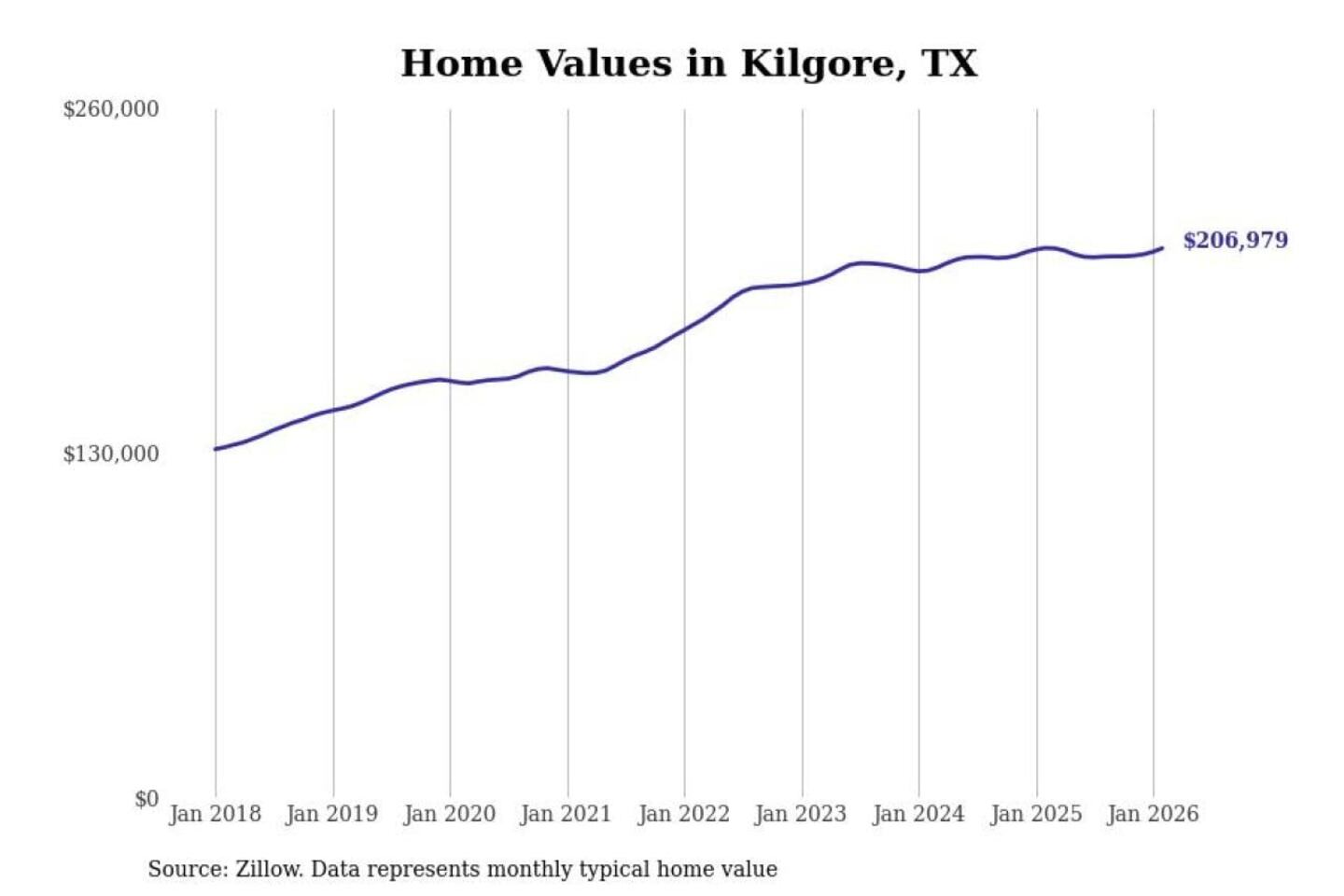 Stacker compiled a list of cities with the most expensive homes in the Longview, TX metro area using data from Zillow. Charts show the monthly typical home value since January 2018.