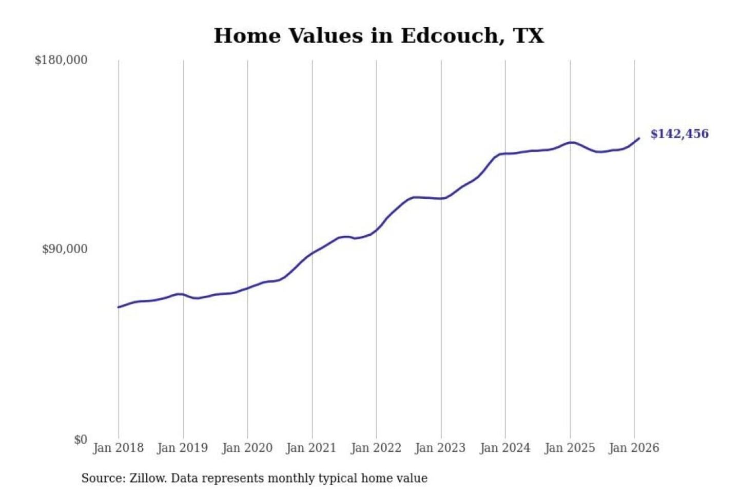 Stacker compiled a list of cities with the most expensive homes in the McAllen-Edinburg-Mission, TX metro area using data from Zillow. Charts show the monthly typical home value since January 2018.