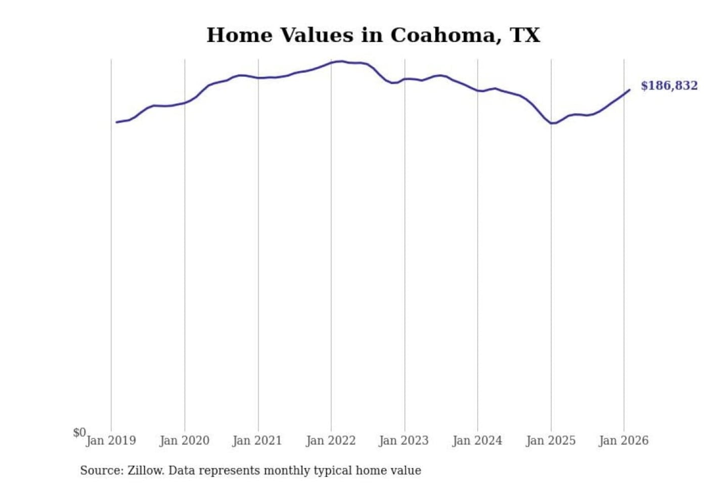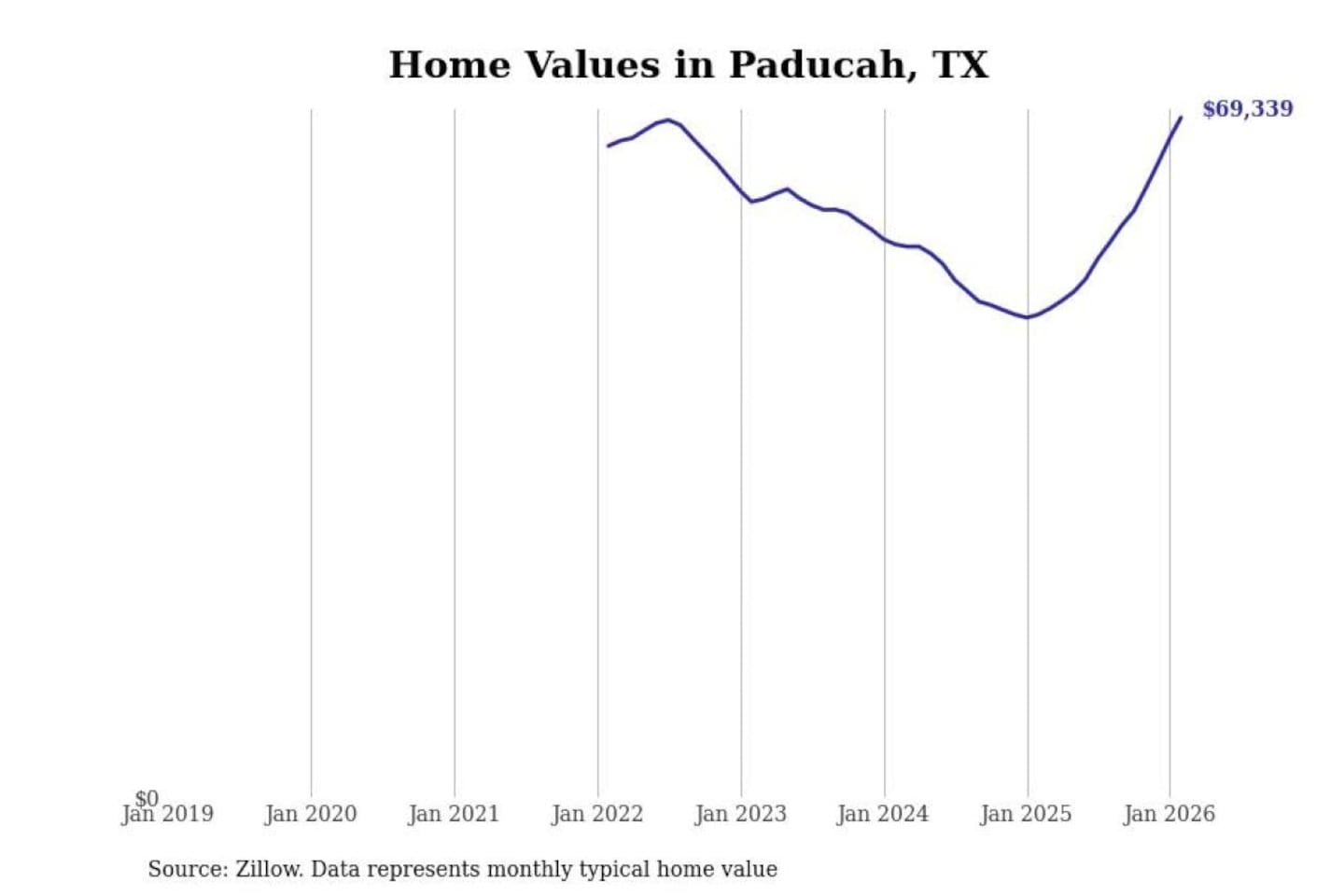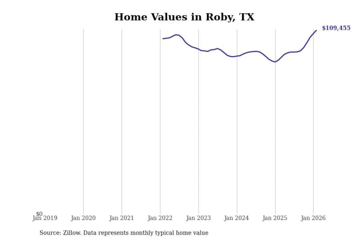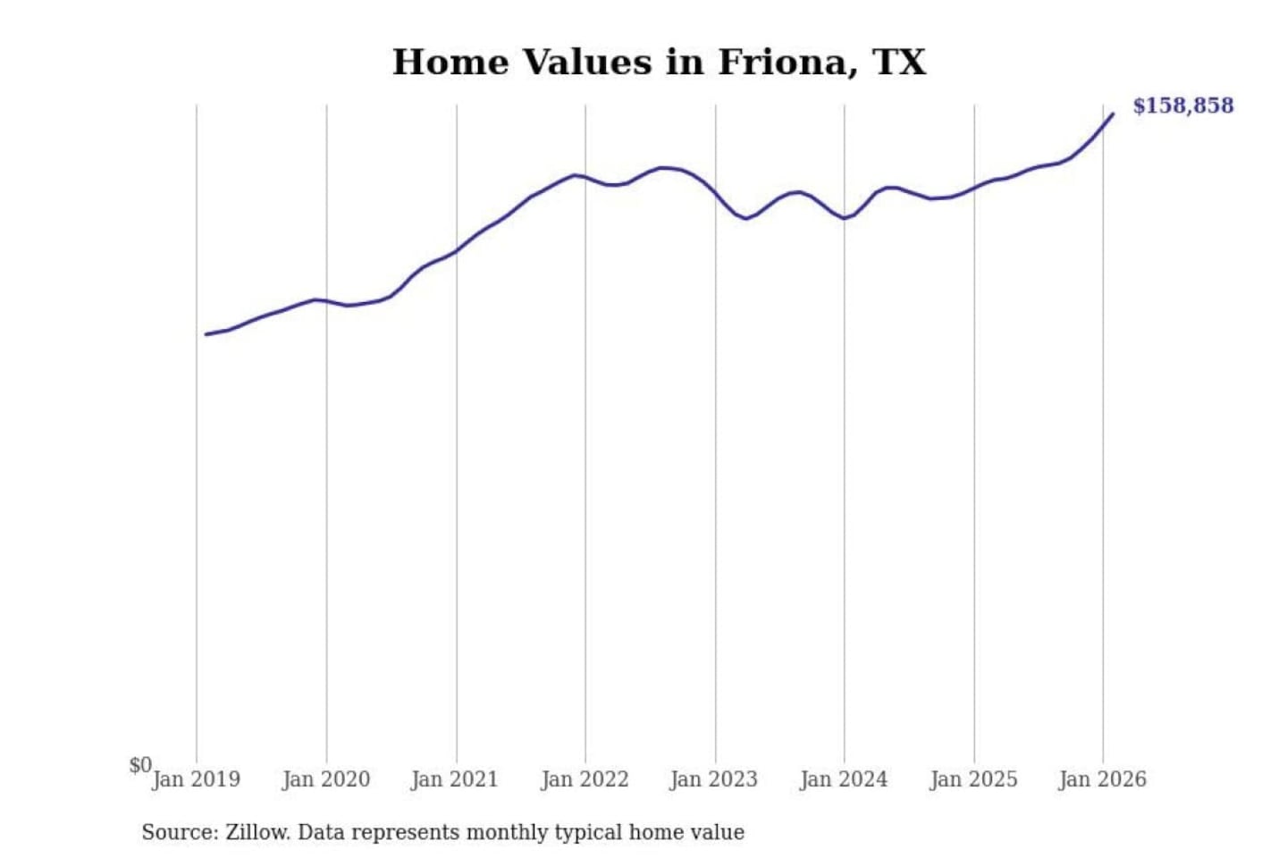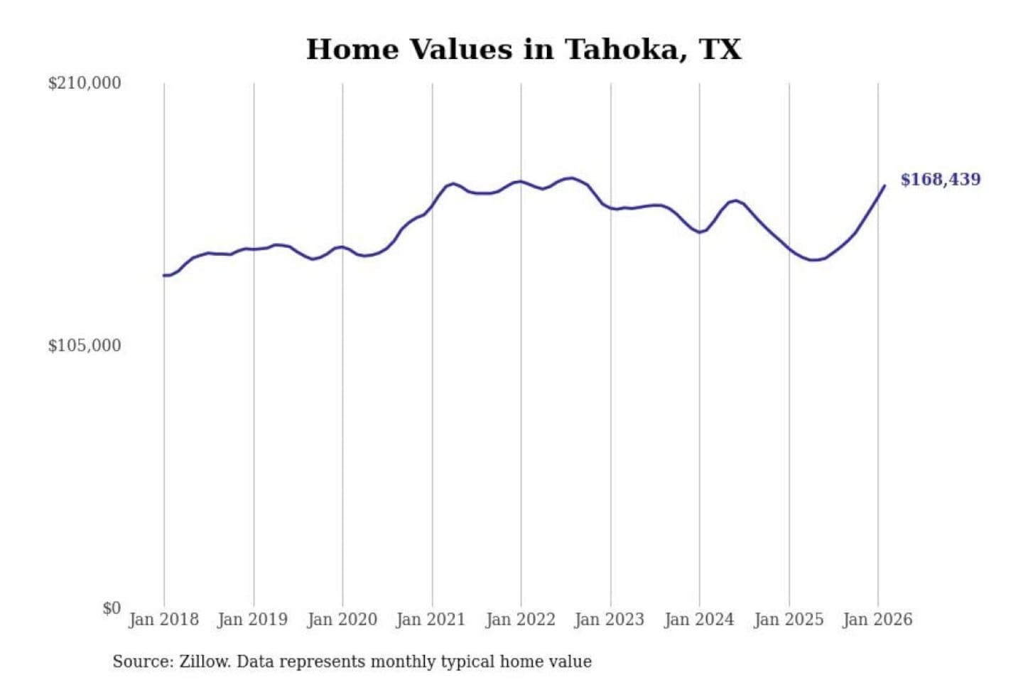 Stacker compiled a list of cities with the fastest-growing home prices in Texas using data from Zillow. Cities are ranked by the dollar change in the Zillow Home Values Index for all homes from the 12 months ending February 2026. The charts in this story were created automatically using Matplotlib. Data was available for 50 cities and towns in Texas.