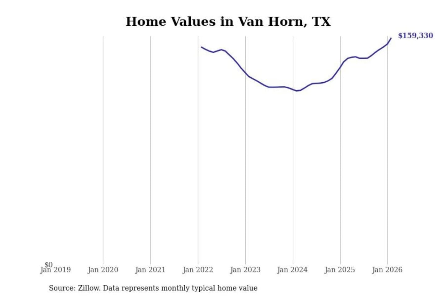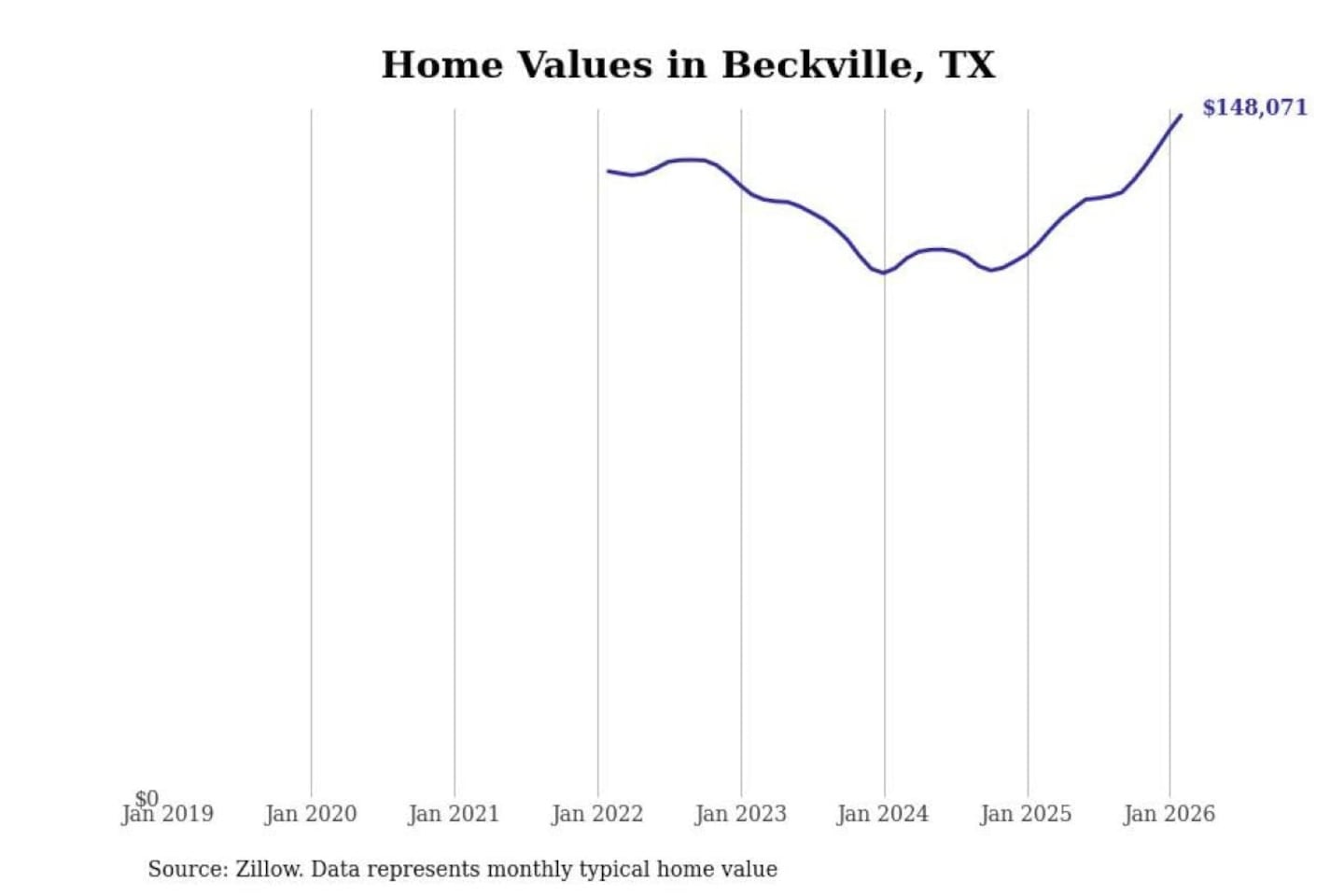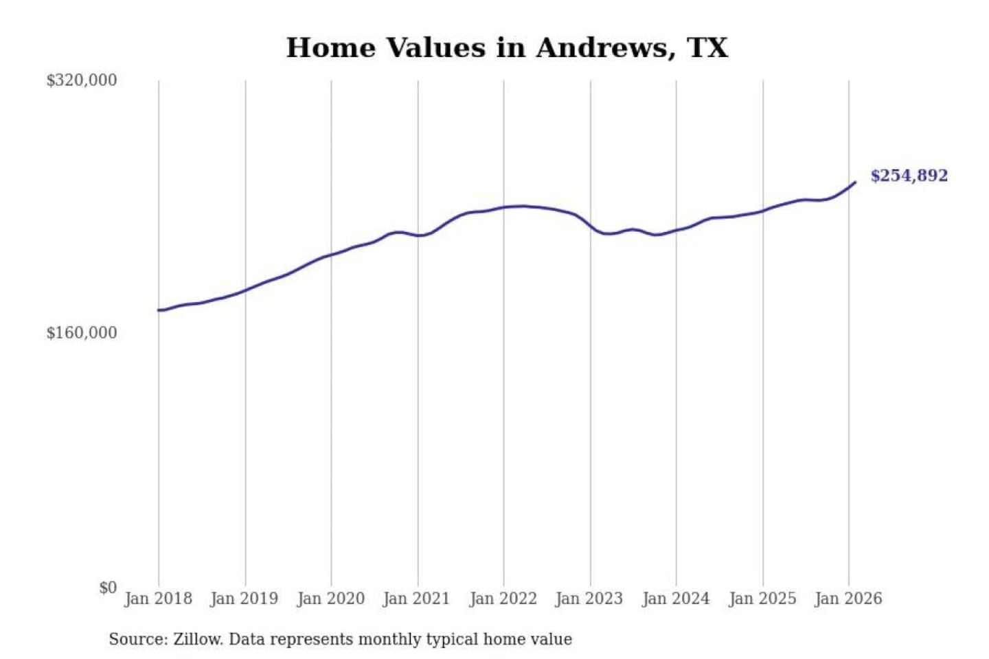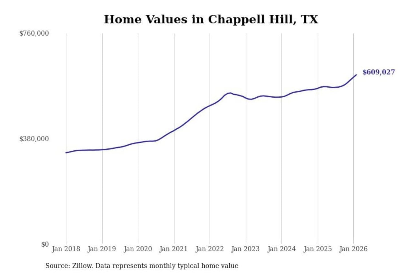 Stacker compiled a list of cities with the fastest-growing home prices in Texas using data from Zillow. Cities are ranked by the dollar change in the Zillow Home Values Index for all homes from the 12 months ending February 2026. The charts in this story were created automatically using Matplotlib. Data was available for 50 cities and towns in Texas.