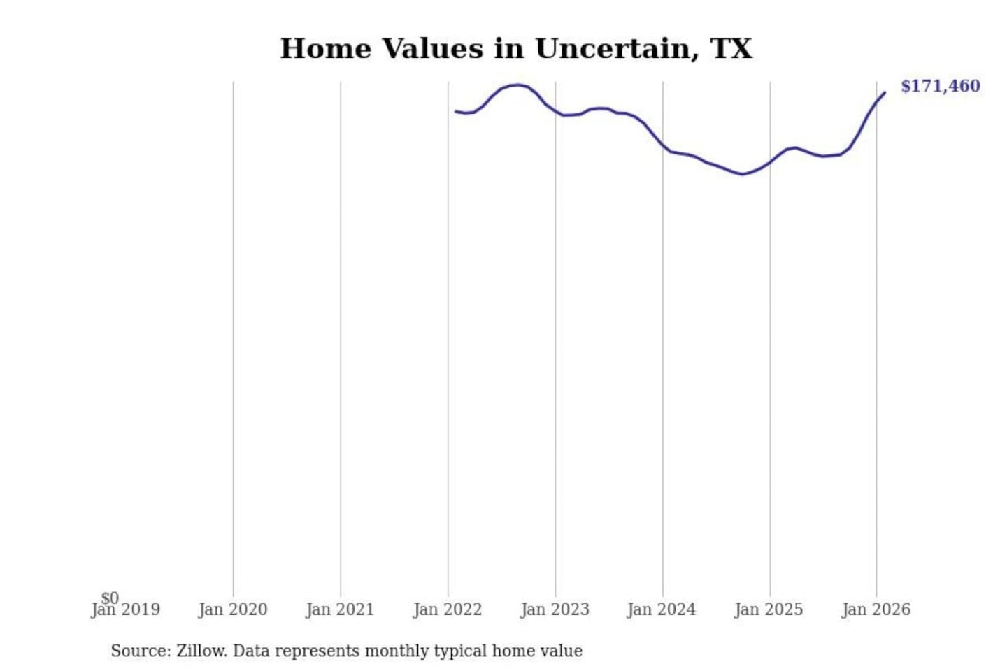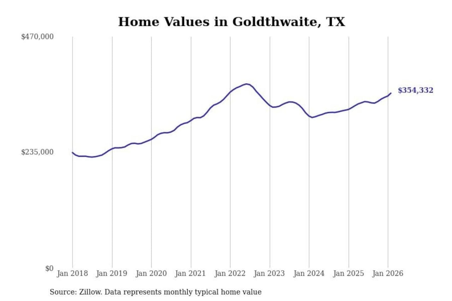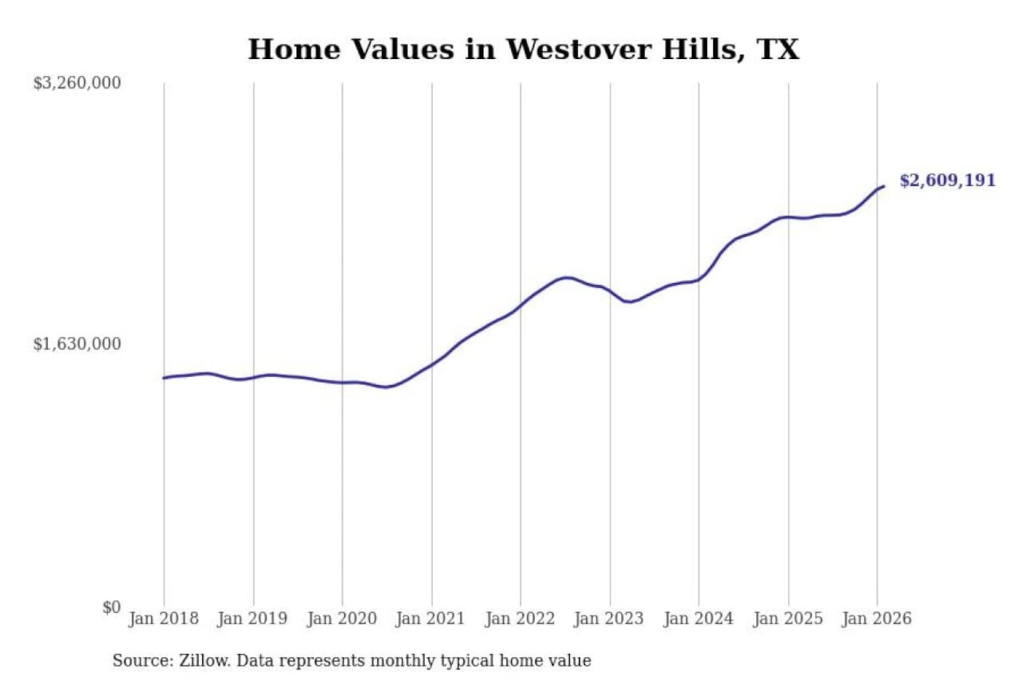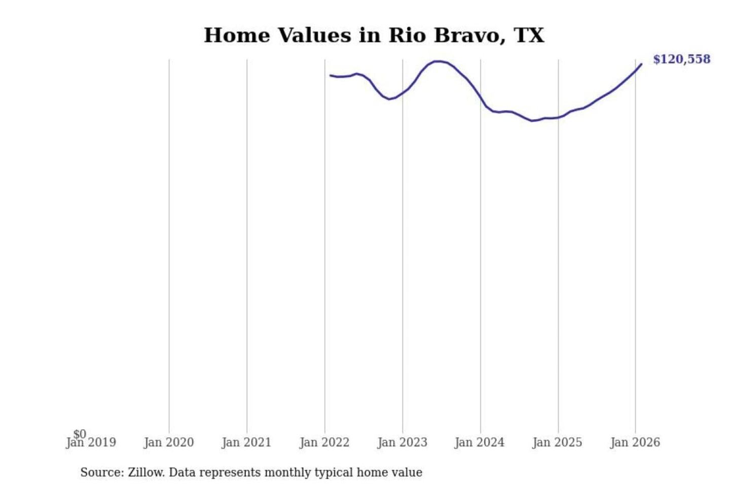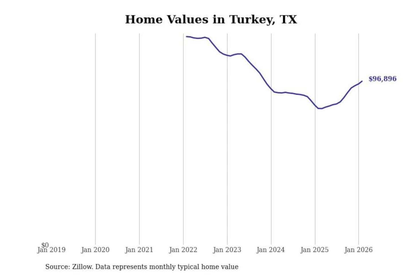 Stacker compiled a list of cities with the fastest-growing home prices in Texas using data from Zillow. Cities are ranked by the dollar change in the Zillow Home Values Index for all homes from the 12 months ending February 2026. The charts in this story were created automatically using Matplotlib. Data was available for 50 cities and towns in Texas.