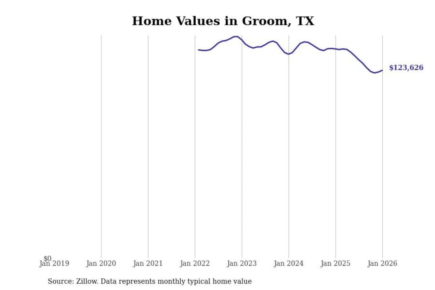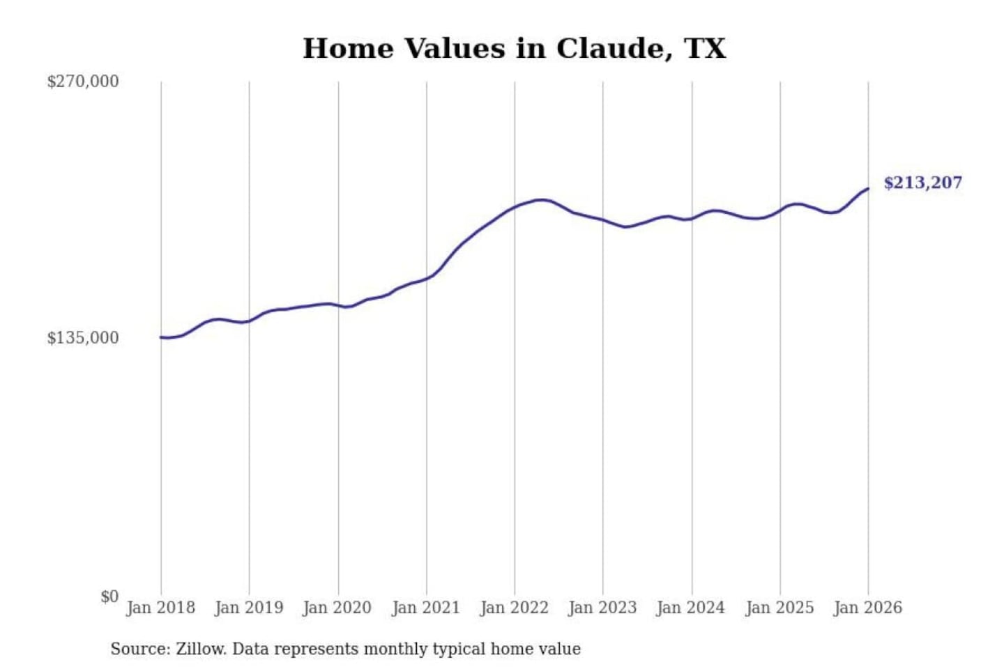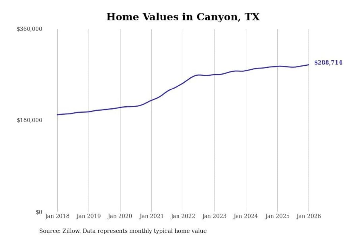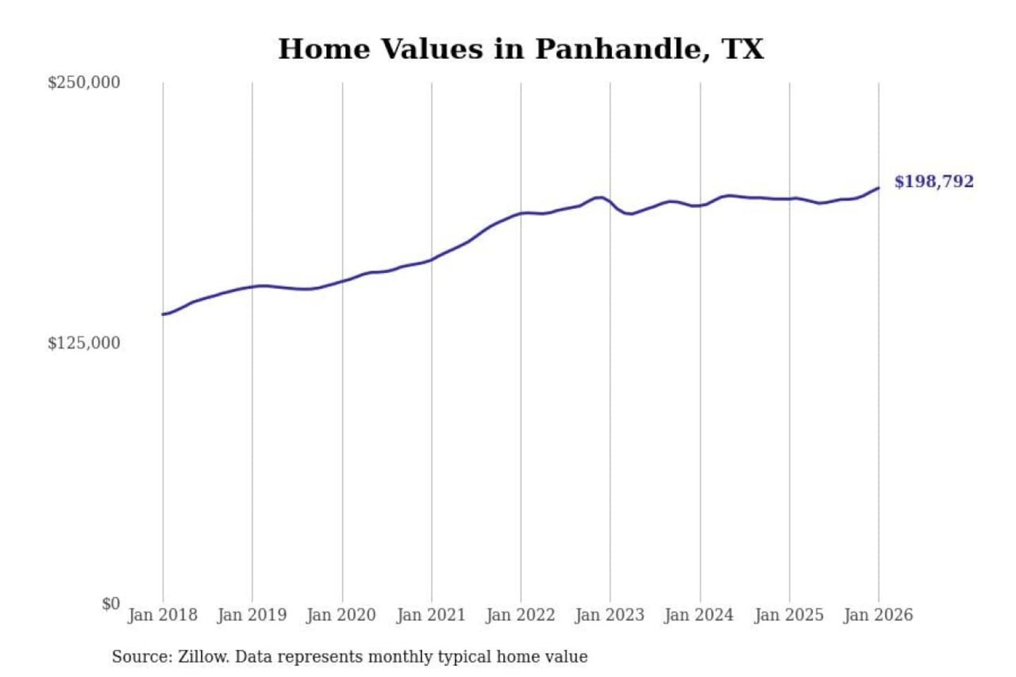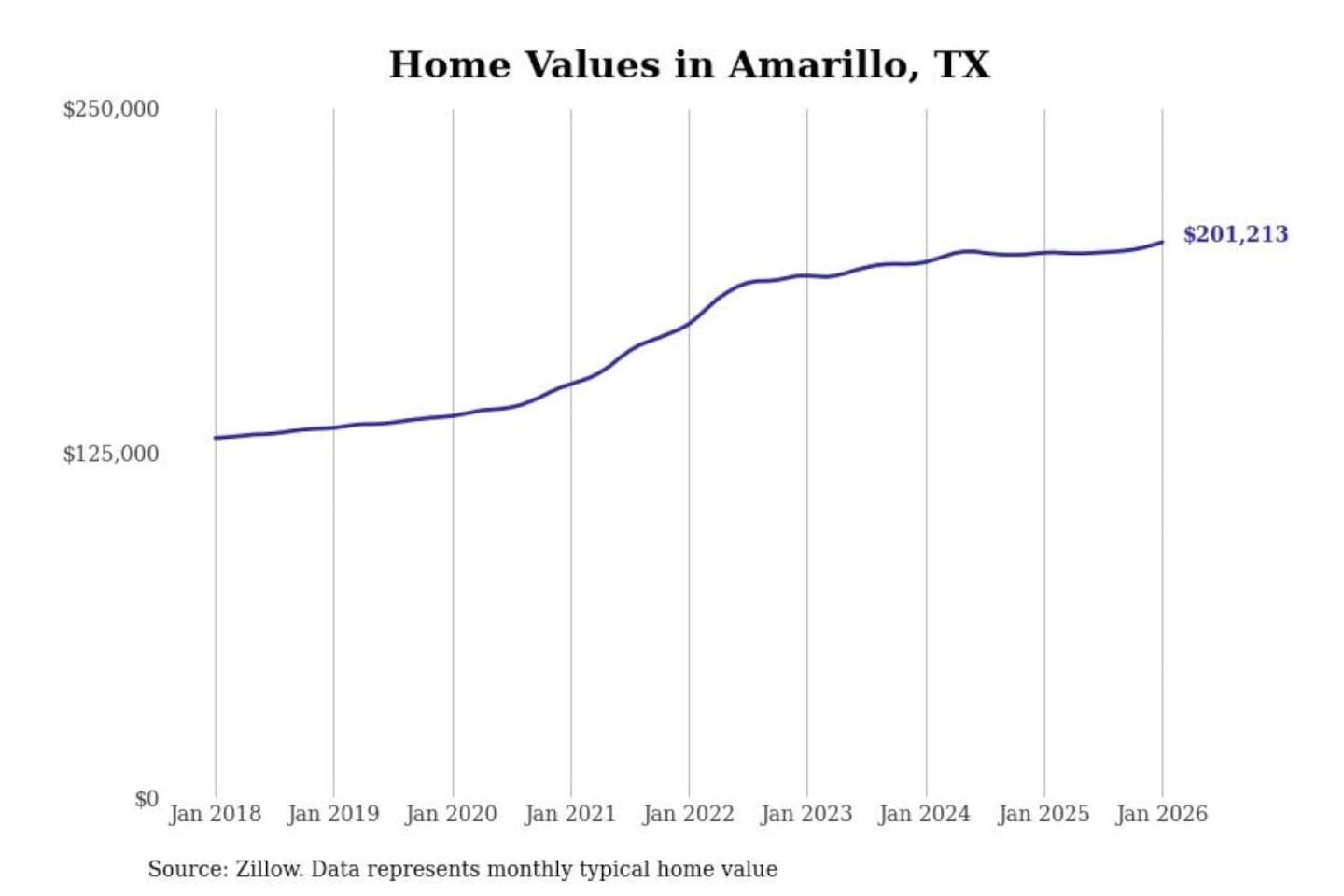 Stacker compiled a list of cities with the most expensive homes in the Amarillo, TX metro area using data from Zillow. Charts show the monthly typical home value since January 2018.