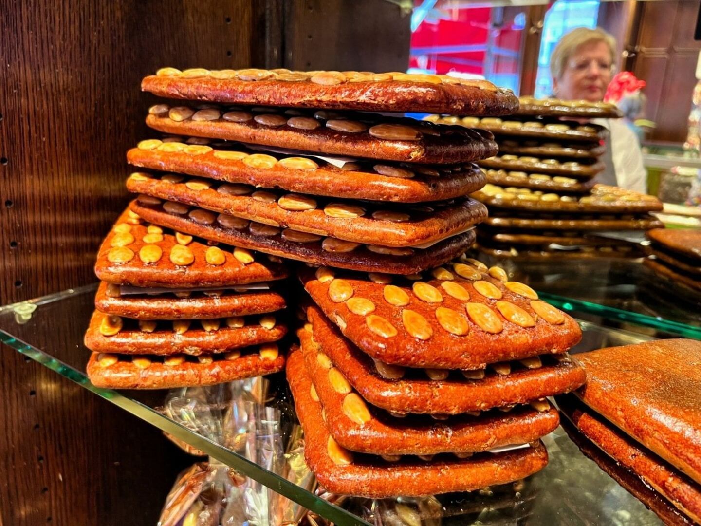 Aachen sits near Germany's borders with Belgium and the Netherlands, a region that once easily imported sweeteners like sugar and honey. But in the 1800s, the Napoleonic Wars stifled supply chains, and locals improvised to make their sweets with beet sugar. Bakers soon added cinnamon, cloves, coriander and orange zest to create Printen, a ginger-free gingerbread cookie that became a local trademark. It's called "printen" because designs are stamped into the top to make an imprint. You can find it throughout the Aachen Christmas Market. It's excellent dipped into a warm drink.
