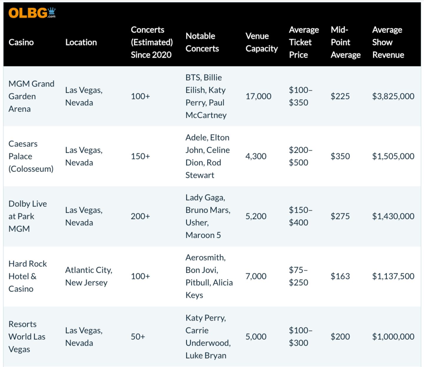 Which is why OLBG looked at 10 of the most popular casinos when it comes to top-tier concerts, including the household names and the revenue they generate, using sources including major ticketing and concert promoter sites, as well as Pollstar.