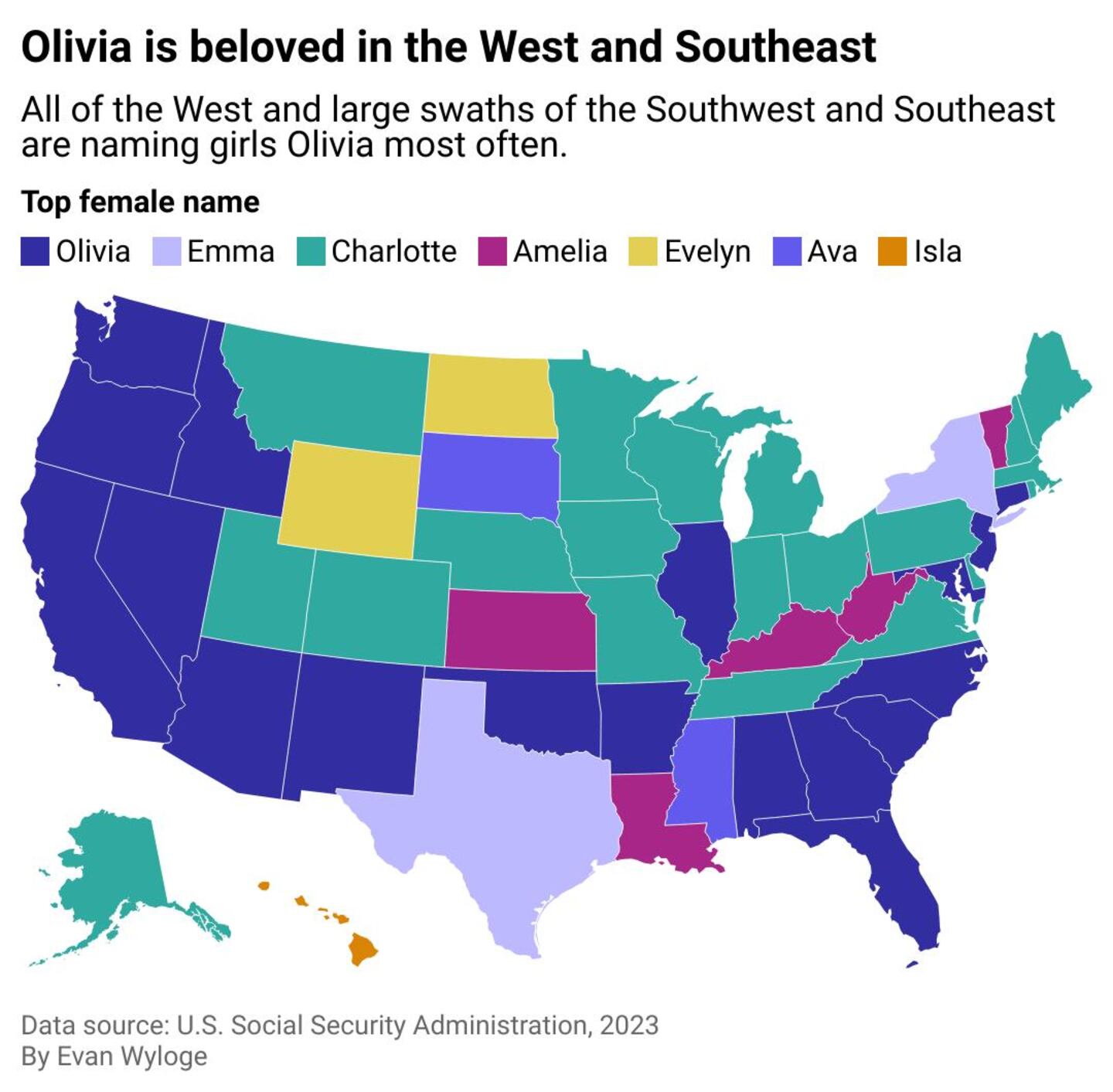 Olivia is the most popular name in 21 states, with a strong presence in the West, where every Pacific Coast state—California, Oregon, and Washington—favor the name above any other. The same is true for other nearby states in the West and Southwest, like Idaho, Nevada, Arizona, and New Mexico. Olivia is also the favorite in the Southeastern states of Florida, Georgia, Alabama, and the Carolinas.