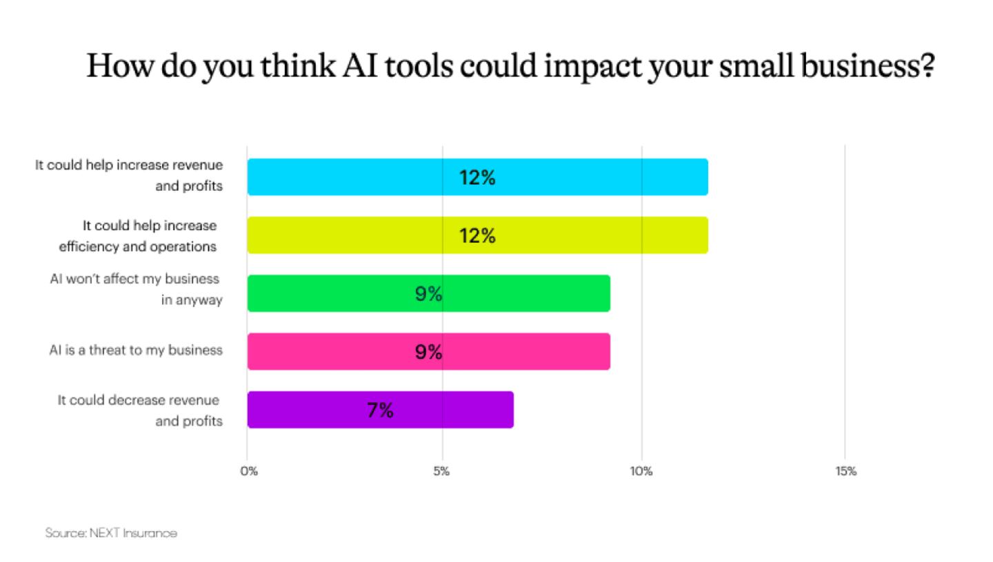 NEXT’s survey data reveals small business owners have mixed feelings about AI’s impact. While some owners (12%) believe AI could boost revenue, and operational efficiency (12%), many remain unsure or skeptical about its value. Some believe AI won’t affect their business in any way (9%), believe it’s a threat to their business (9%) or that it will decrease their profits (7%).