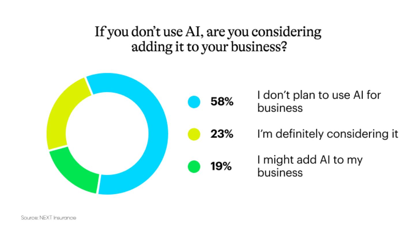 This year, just 19%—roughly 1 in 5 business owners—might add it. And 58% say they don’t plan to use AI for business at all.