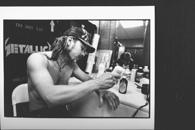 James Hetfield James Hetfield, lead singer and rhythm guitarist for the rock group Metallica, putting aloe on burn scars on his arm inflicted when he strayed into the path of 12-foot-high special-effects flames during Montreal concert, in dressing room, backstage at Oa.kland Coliseum (Photo by John Storey/Getty Images) (John Storey/Getty Images)
