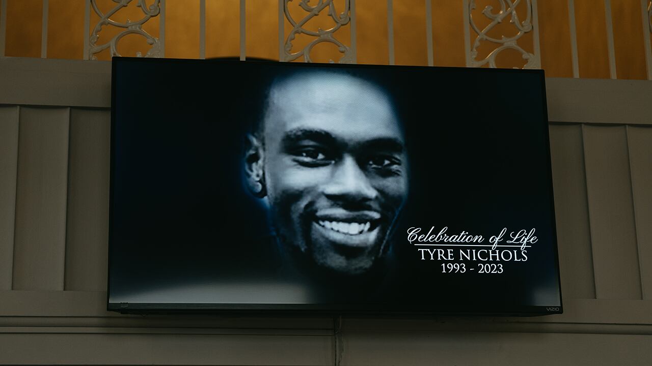 Tyre Nichols remembered A screen at the entrance of Mississippi Boulevard Christian Church displays the celebration of life for Tyre Nichols on Feb. 1, 2023, in Memphis, Tennessee. On Jan. 7, 29-year-old Nichols was beaten for three minutes by Memphis police officers during a traffic stop. He died of his injuries three days later. (Lucy Garrett/Getty Images, File)